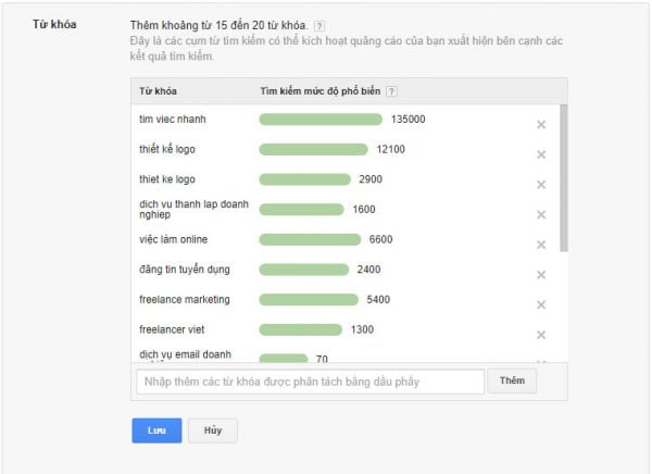 Từ khóa là những cụm từ tìm kiếm người dùng nhập vào thanh tìm kiếm của Google khi họ thực hiện tìm kiếm. Google sẽ cho bạn lựa chọn khoảng từ 15 đến 20 từ khóa giúp kích hoạt quảng cáo của bạn và bạn luôn có thể thêm những từ khóa khác về sau.