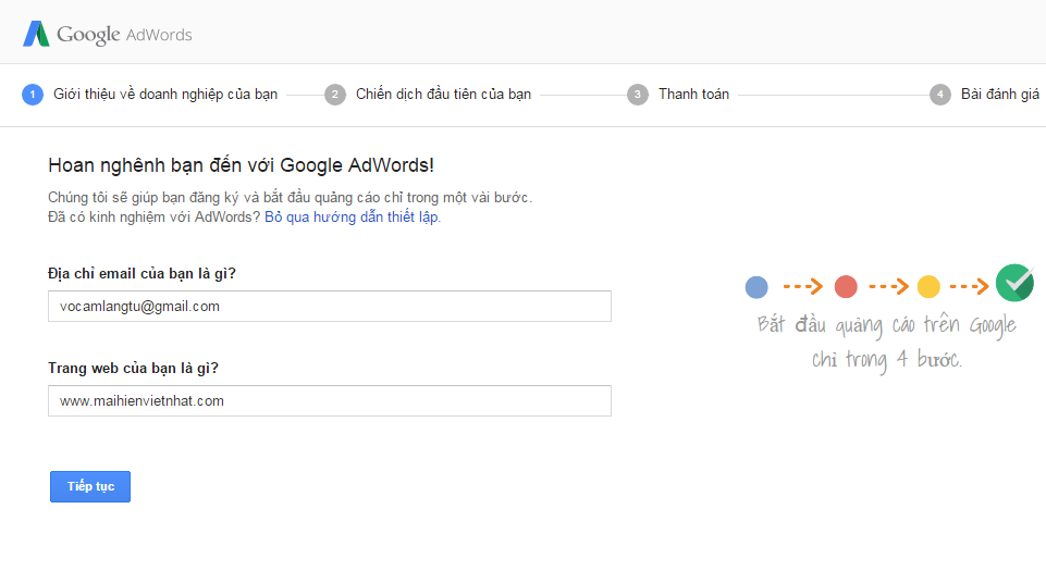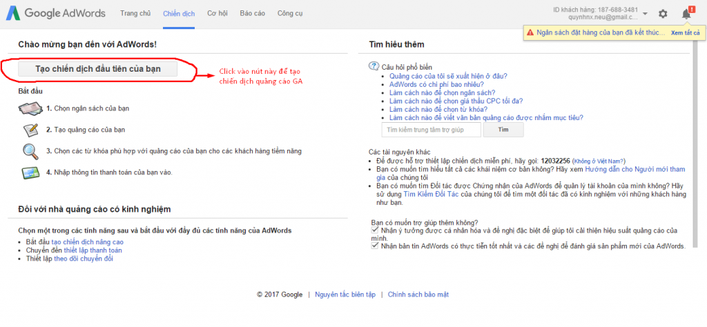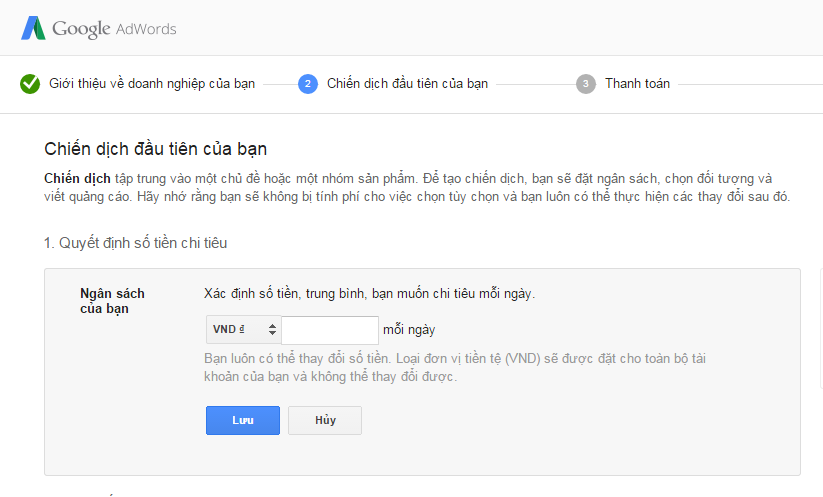 Sau đó, bạn hãy điền đầy đủ thông tin cho chiến dịch quảng cáo Google Adwords của mình nhé. Hãy làm theo hưỡng dẫn của Google bạn sẽ đến được những trang sau. Như vậy bạn đã tạo nên chiến dịch quảng cáo đầu tiên của mình. Đừng quên chọn ngân sách, đối tượng tập trung, đặt giá thầy và viết nội dung quảng cáo nhé.