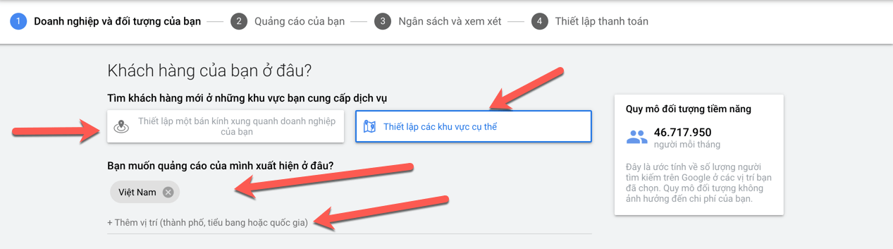 Ở bước này, khi chạy quảng cáo Google Adwords bạn sẽ phải lựa chọn: Vị trí địa lý của đối tượng mục tiêu. Điều này sẽ giúp quảng cáo của bạn được hiện thị cho những người dùng tìm kiếm từ khóa đó ở vị trí đó.