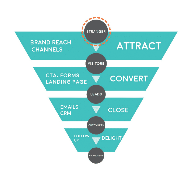 Hãy tưởng tượng quá trình marketing và bán hàng của bạn như một cái phễu. Những người truy cập nằm ở tầng trên của phễu và những khách hàng hạnh phúc sẽ nằm ở cuối phễu.