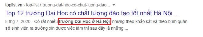 Toplist.vn là ví dụ thành công trong trường hợp này: Khi người dùng tìm kiếm cụm từ “trường đại học ở Hà Nội” thì website của họ nhanh chóng hiện lên TOP đầu ngay sau các trang quảng cáo trên SERP. Mặc dù truy vấn không xuất hiện chính xác như thông tin trên tiêu đề hoặc URL.